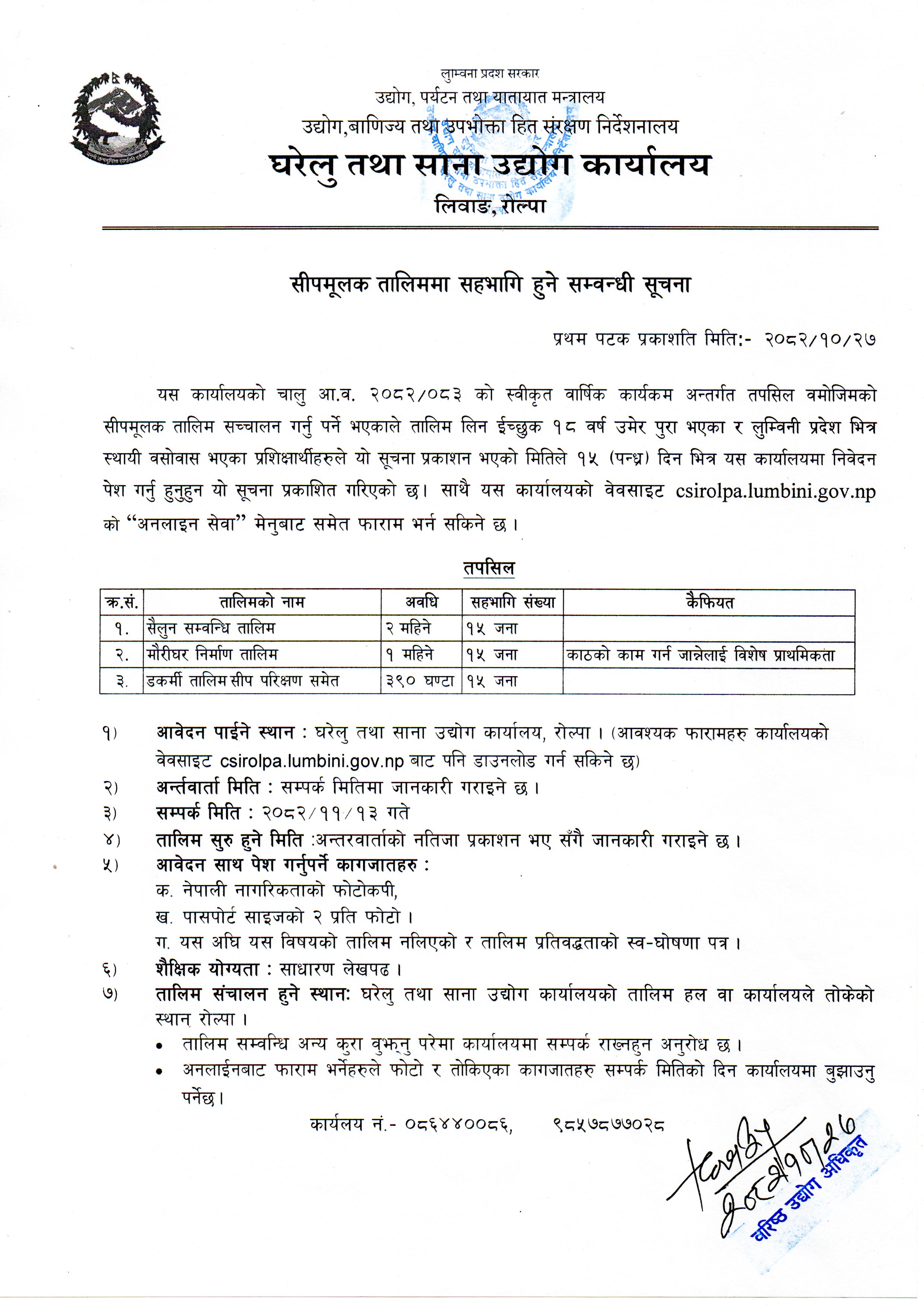 सिप विकास तालिम (सैलुन, डकर्मी र मौरीघर निर्माण) को सूचना