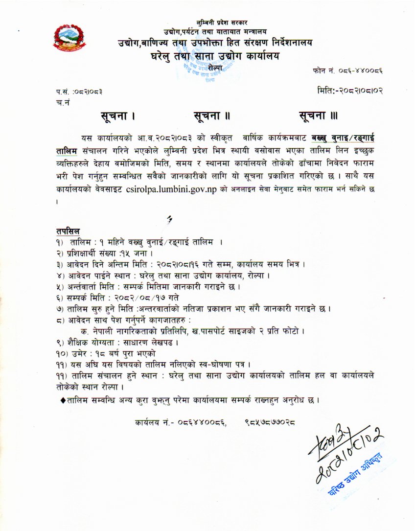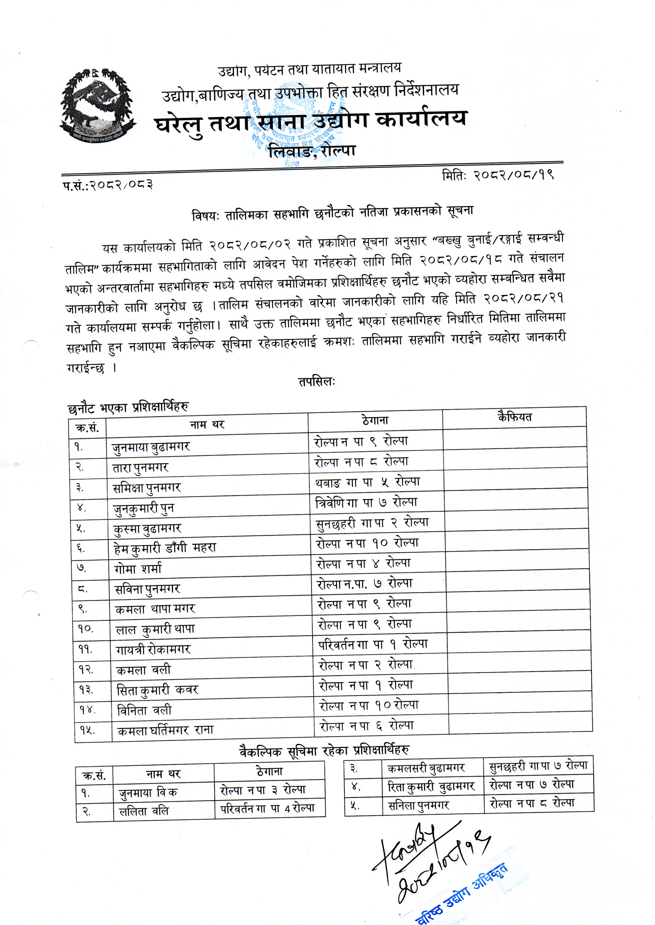 बख्खु वुनाई/रङ्गाई सम्वन्धी तालिम प्रशिक्षार्थी छनौट नतिजा प्रकाशन