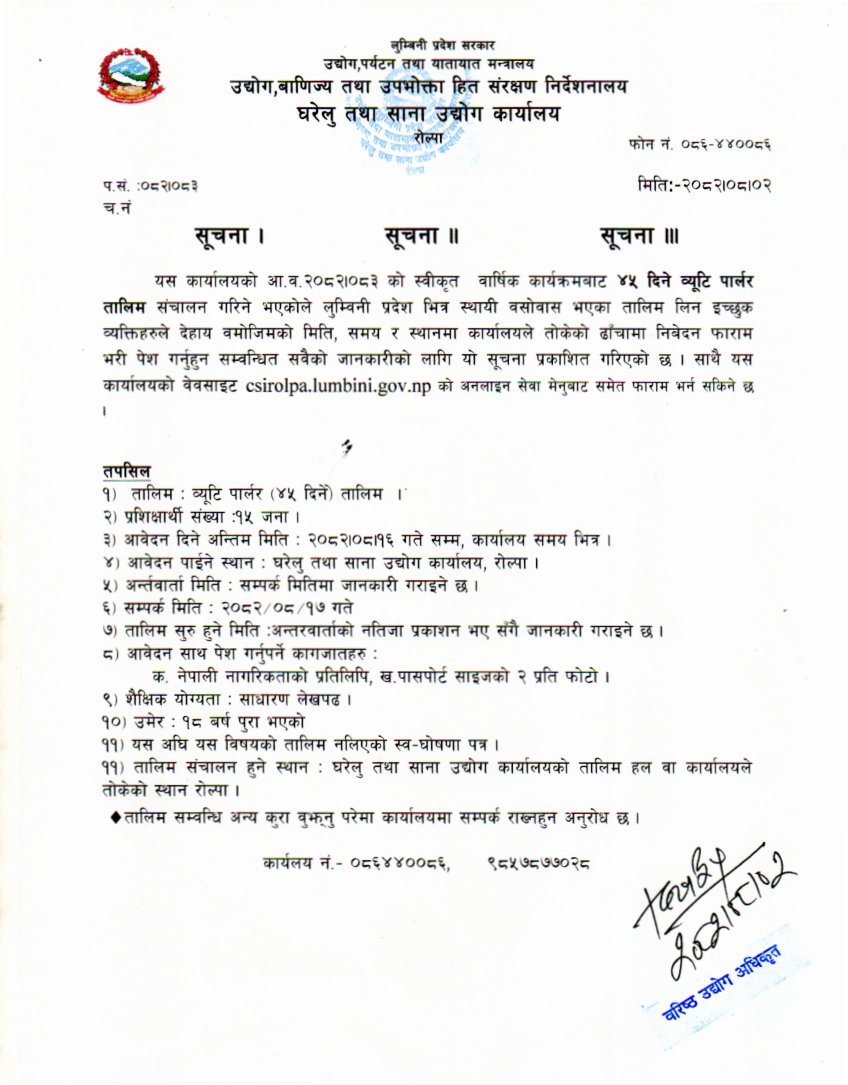 व्यूटिपार्लर सम्वन्धी तालिम प्रशिक्षार्थी छनौट नतिजा प्रकाशन
