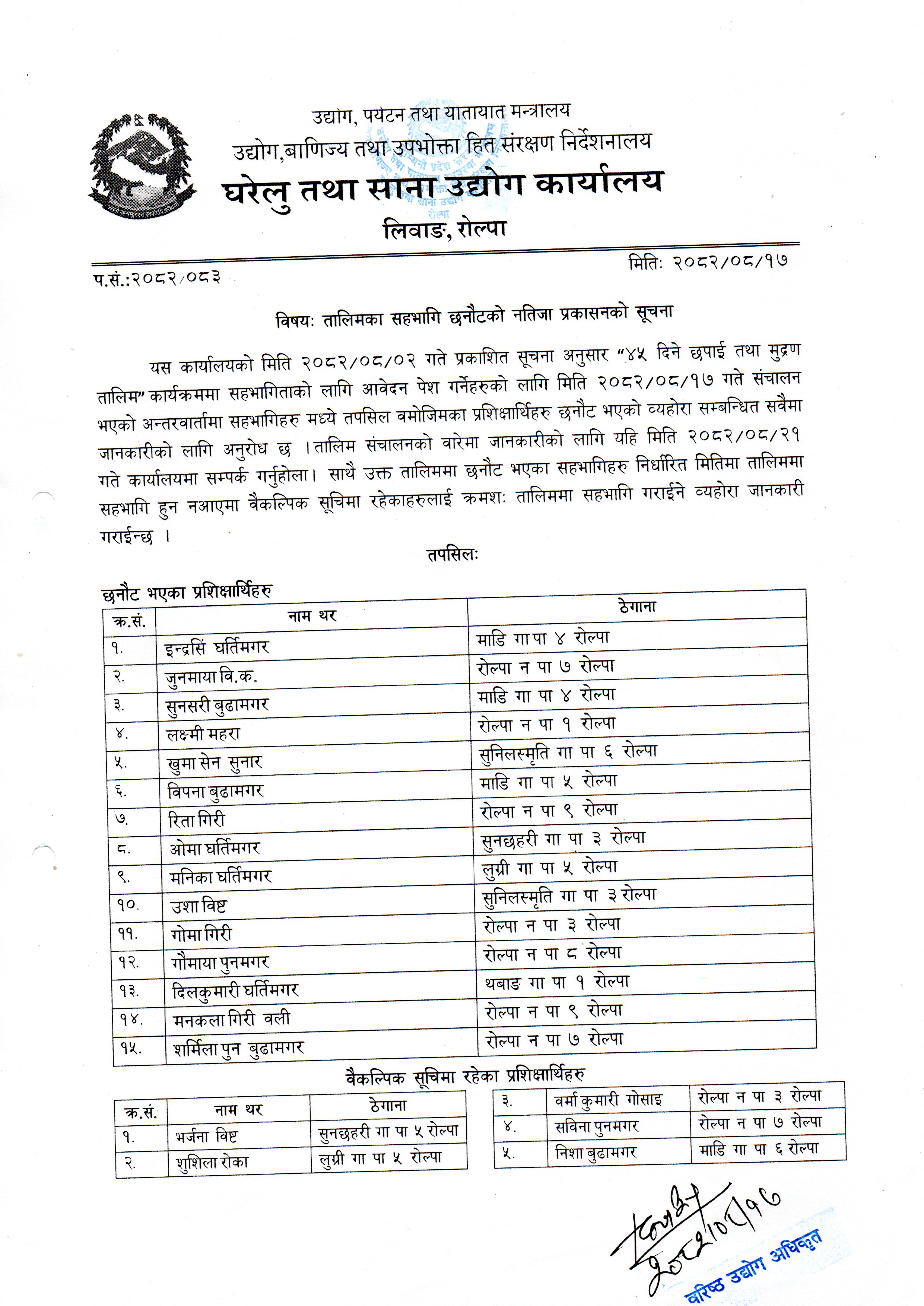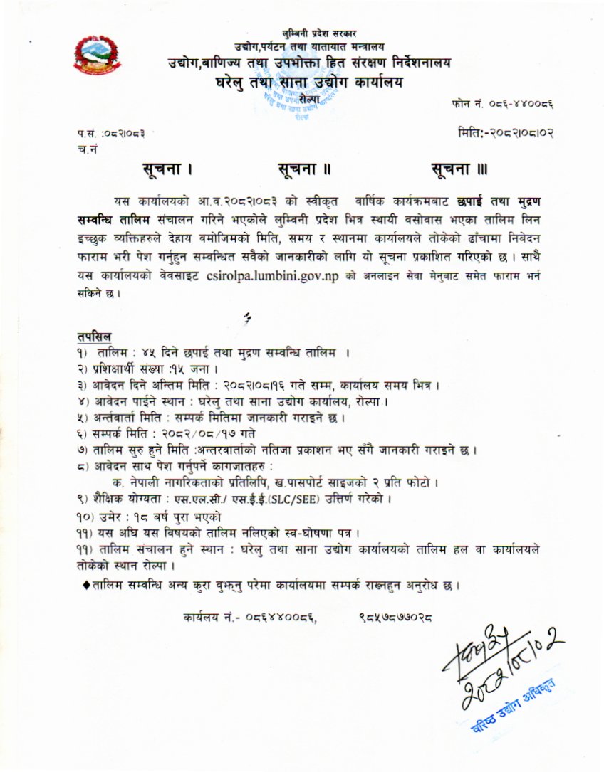 छपाई तथा मुद्रण सम्वन्धी तालिम प्रशिक्षार्थी छनौट नतिजा प्रकाशन