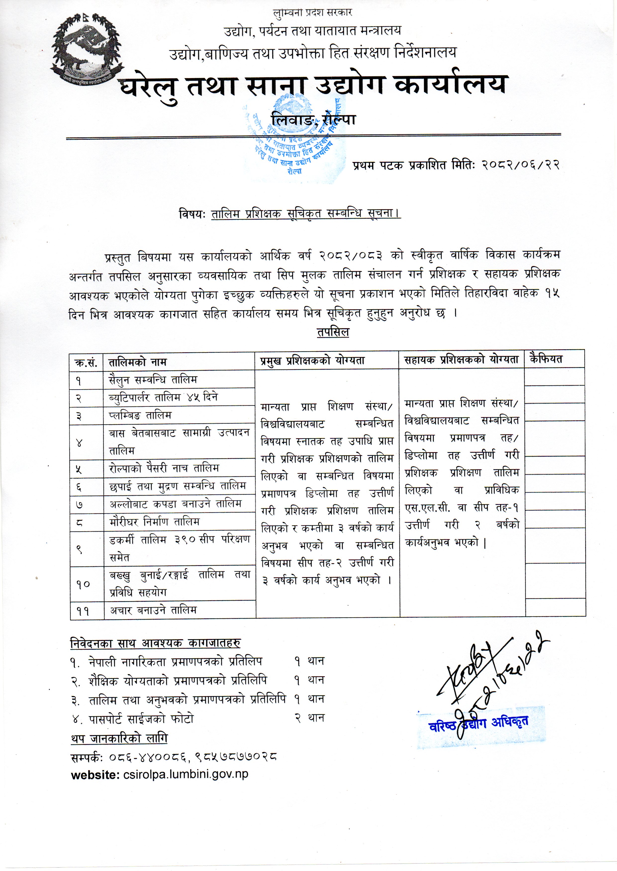 तालिम प्रशिक्षक सूचिकृत सम्बन्धि सूचना